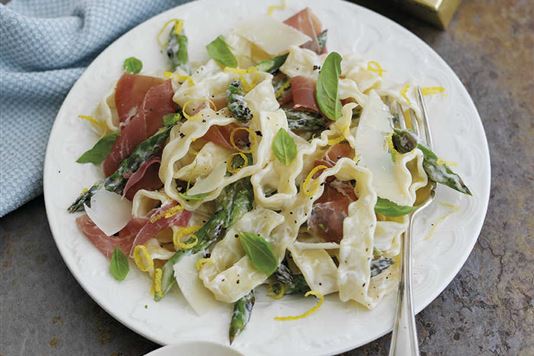 Add the crème fraîche to the drained pasta in the pan and toss to coat, then tip in the asparagus and Parma ham and season to taste with sea salt and pepper.